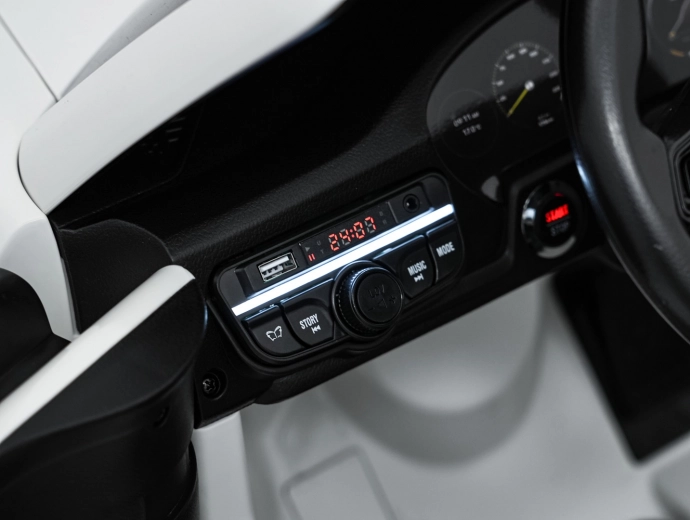 Das leistungsstarke 24V-10Ah-System wird von vier Motoren 4×200 W angetrieben, sodass das Auto auch höhere Belastungen bis zu 50 kg mühelos bewältigt. Die 2,4-GHz-Fernbedienung ermöglicht Eltern, Richtung und Geschwindigkeit (3 Stufen) sicher zu steuern oder sofort zu stoppen. Das Multimedia-Panel mit FM-Radio, USB, MP3, AUX und Bluetooth spielt Lieblingssongs ab, während die Batteriestandsanzeige die Energie im Blick behält.