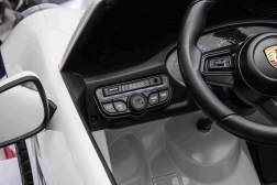 Das umfangreiche MP4-Audiopanel bietet FM-Radio, MP3, USB, Bluetooth und AUX. Lenkradtöne und Hupe sowie vorinstallierte Melodien sind ebenfalls an Bord. Der Doppelsitz aus Öko-Leder mit Velours verfügt über 3-stufige Einstellung und Sicherheitsgurte. Eltern schätzen die 2,4-GHz-Fernbedienung mit drei Geschwindigkeiten und Stopp-Funktion, die Batteriestandsanzeige und die hochwertige Verarbeitung.
