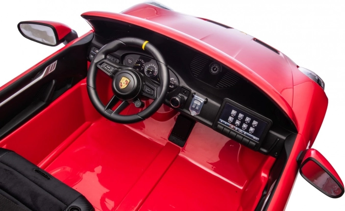 - FM-Radio, MP3, AUX, Bluetooth, USB, Sounds und Hupe im Lenkrad, integrierte Melodien, herausnehmbares MP4-Tablet, SPORT-Modus (Motorsound beim Gasgeben)