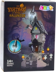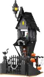 Das thematische HALLOWEEN-Spukhaus verbindet Bauspaß mit einer düsteren, fesselnden Ästhetik. Enthalten sind ein hoher Turm, ein Zaun mit Tor, Kürbisse, Fledermäuse und eine Laterne auf einem Pfosten – alles in kontrastreicher, dunkler Farbgebung, sodass das Modell im Regal wie auch zwischen Festtagsdekorationen auffällt.