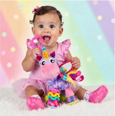 Suchen Sie ein Sinnes-Spielzeug, das Ihr Baby auf den ersten Blick und Berührung begeistert? Einhorn Stella kombiniert weiche Plüschmaterialien, knisternde Flügel, klingelnde Ringe und ein sicheres Spiegelchen am Flügel. Ein glänzendes Horn, ein silberner Flügel und ein mehrlagiger Schweif unterstützen neugieriges Entdecken und die Feinmotorik.