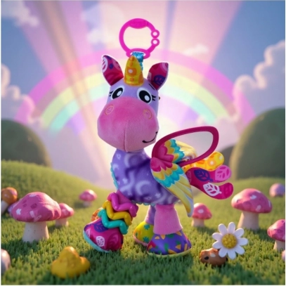 Dank des universellen Clips lässt es sich im Handumdrehen am Kinderwagen oder Autositz befestigen – der ideale Begleiter für Spaziergänge und Reisen. Kontrastreiche Muster und leuchtende Farben fördern die visuelle Wahrnehmung, während das gerippte Bäuchlein und strukturierte Elemente zum taktilen Erkunden anregen. Das Spielzeug ist leicht, sicher und ab der Geburt geeignet.
