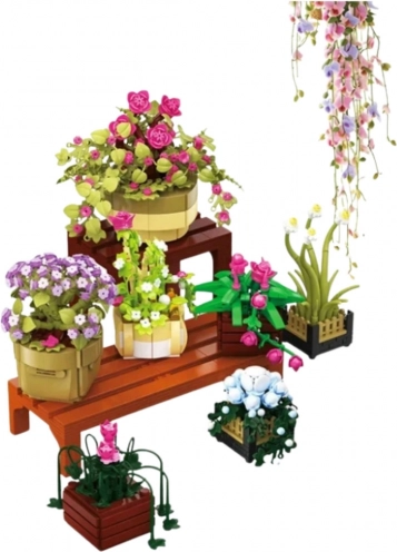 Bauen Sie ein elegantes botanisches Arrangement aus bis zu 1446 Teilen: 7 Blumen in Blumentöpfen auf einem dreistufigen Regal in Holzoptik. Eine großartige Wahl für Liebhaber von kreativem Bauen, Innendekoration und DIY – ganz ohne Gießen, stets perfekt arrangiert und bereit, Regal, Schreibtisch oder Vitrine zu schmücken.
