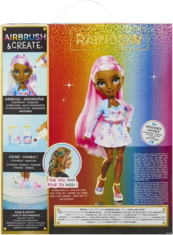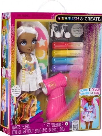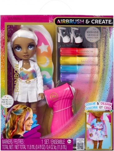 Die RAINBOW HIGH Air Brush Puppe ist als „leere Leinwand“ konzipiert, die Kinder nach ihren Vorstellungen gestalten können. Das Set enthält ein Airbrush-Handwerkzeug für Filzstifte, vier auswaschbare Farbstifte (Rot, Gelb, Blau, Lila), Schablonen für einfaches Dekorieren sowie ein komplettes weißes Outfit inklusive Schuhe. Die Farben lassen sich mit dem Zerstäuber auftragen oder direkt mit dem Stift für präzise Details – auf Haare, Kleid und Accessoires.