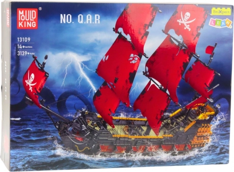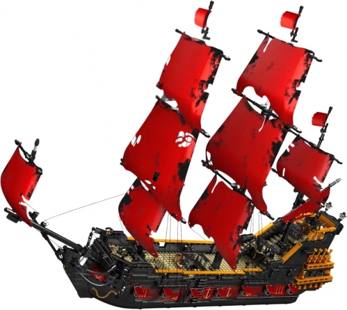 Monumentales Piratenschiff als Bausatz mit 3139 Teilen, roten Stoffsegeln und realistischen Details, kompatibel mit beliebten Systemen. Ideal für Sammler.