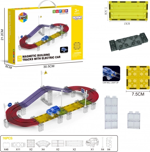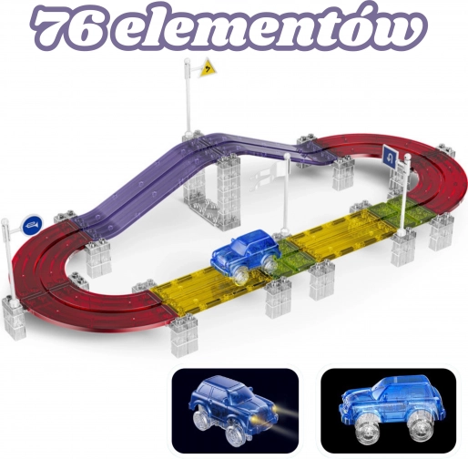 Entdecken Sie ein Konstruktionsset, das mit der Fantasie Ihrer Kinder mitwächst. Die magnetischen Elemente haften schnell und fest aneinander und ermöglichen das Bauen von Brücken, Rampen und scharfen Kurven ganz ohne Werkzeug. Dank des LED-beleuchteten Autos ist die Fahrt auch bei ausgeschaltetem Licht attraktiv.