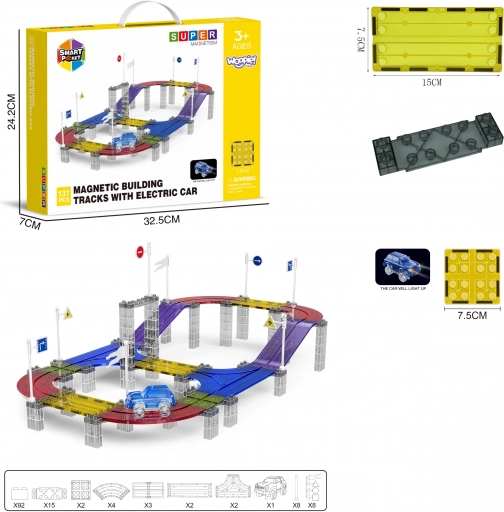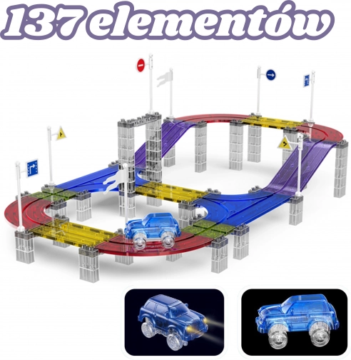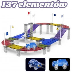 Entdecken Sie die kreative Welt der WOOPIE-Baukasten-Rennbahn, die Fantasie, Kreativität und logisches Denken fördert. Die Magnetteile haften schnell und fest aneinander, sodass Kinder ab 3 Jahren die Montage ohne Werkzeug bewältigen. Die farbigen, transparenten Elemente in Kombination mit dem LED-Auto schaffen eine fesselnde Lichtshow.