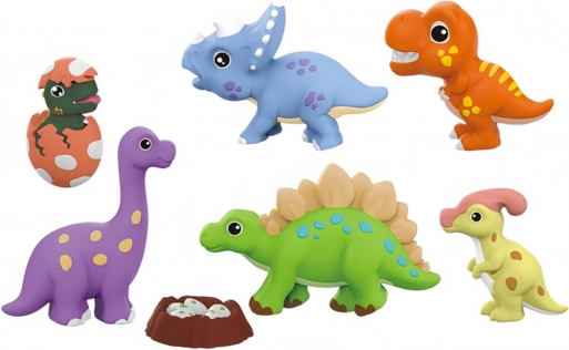 - Verschiedene Dinosaurier und Formen: Stegosaurus, Triceratops, Tyrannosaurus, Brontosaurus, Parasaurolophus und Dino-Ei