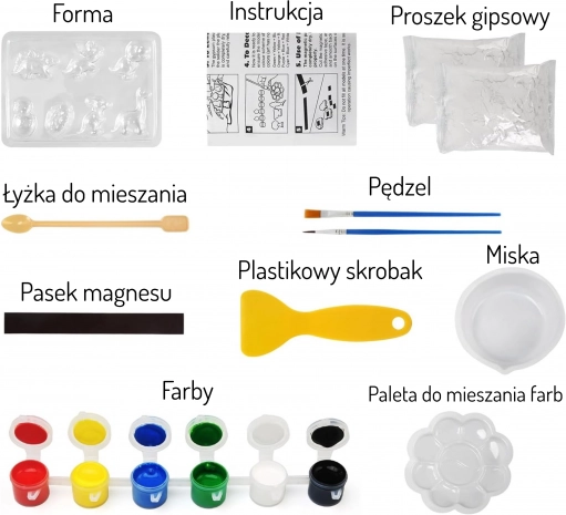 - Alles im Set enthalten: Formen, Gips, Schüssel, Löffel, Palette, 6 Farben, Pinsel, Spachtel, Anleitung
