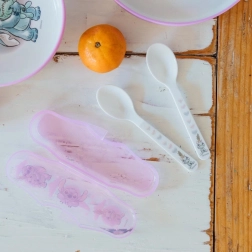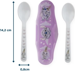 Praktisches Set aus zwei Kinderlöffeln mit Etui im Motiv Lilo & Stitch – ideal für unterwegs und für den Kindergarten. Die ergonomische Form passt sich kleinen Händen perfekt an, das Reise-Etui hält die Löffel sauber und hygienisch und das Material ist BPA-frei. Entspricht der Norm EN 14372.