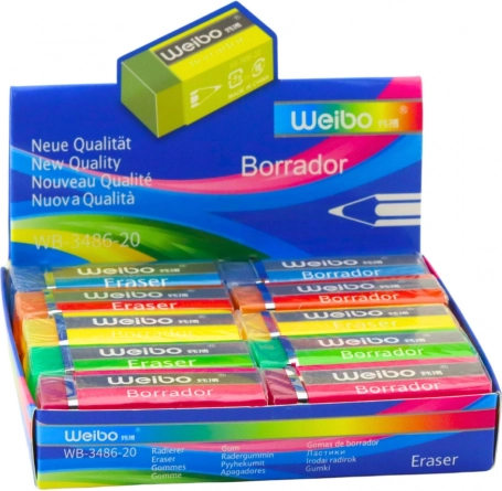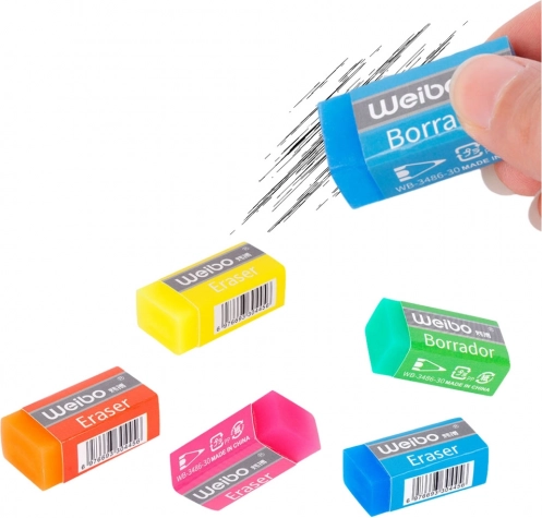 Der praktische und stylische Radiergummi WEIBO in leuchtenden Farben entfernt zuverlässig Spuren eines Bleistifts, ohne Schlieren zu hinterlassen und ohne das Papier zu beschädigen. Dank der Maße 6 × 2 × 1 cm liegt er gut in der Hand, hält lange und seine kräftigen Farben machen ihn im Mäppchen oder auf dem Schreibtisch leicht auffindbar. Feines synthetisches Material ohne Latex, effektives Radieren ohne Verschmieren und zufällige Farbauswahl machen ihn zur idealen Wahl für Schule und Büro.