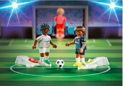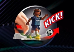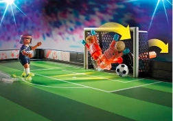 Bauen Sie die faltbare Arena auf, stellen Sie die Teams auf und der Anpfiff kann erfolgen! Dieses Set der Reihe PLAYMOBIL Sports & Action bietet dynamisches Spiel mit tollen Funktionen. Mit dem praktischen Mechanismus lassen sich Spieler zum Ball schießen und präzise aufs Tor zielen, während Torhüter an beweglichen Stangen blitzschnell reagieren und Schüsse abwehren können.