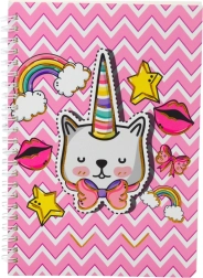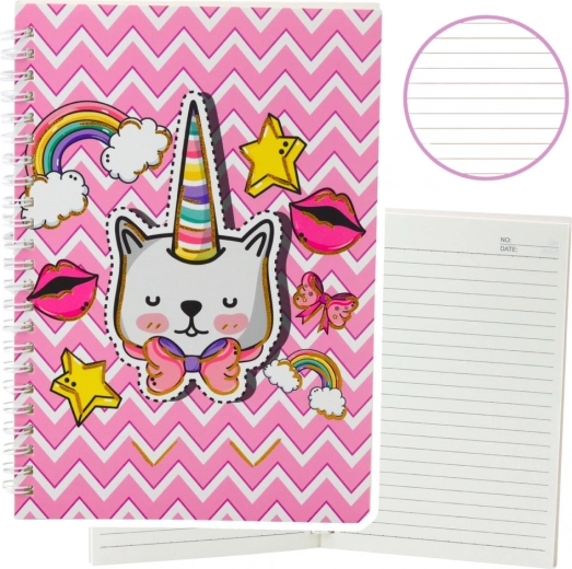 Dieses stylische und praktische Heft verbindet Funktionalität mit verspieltem Design. Der rosa Umschlag mit Zickzack-Muster und Motiven wie Regenbogen, Sternchen, Lippen und Schleifchen zieht die Blicke auf sich und verleiht jedem Schreiben einen Hauch Magie. Die Hauptillustration ist eine Katze mit Einhornhorn, die dem Heft eine märchenhafte Note gibt.