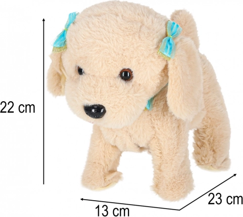 Das Spielzeug besteht aus weichem Plüsch in Kombination mit robustem Kunststoff. Die Stromversorgung erfolgt über 3× AA-Batterien (nicht im Lieferumfang enthalten). Ebenfalls enthalten sind eine stylische Leine mit einer Länge von 65 cm und farbige Accessoires, die dem Hund ein einzigartiges Aussehen verleihen.