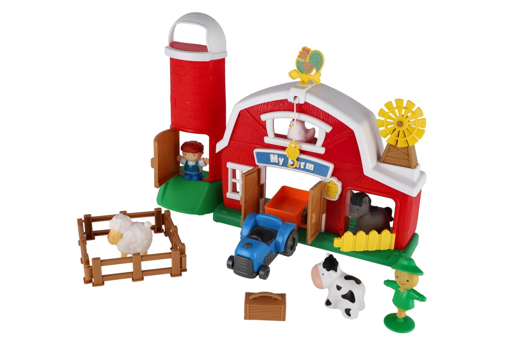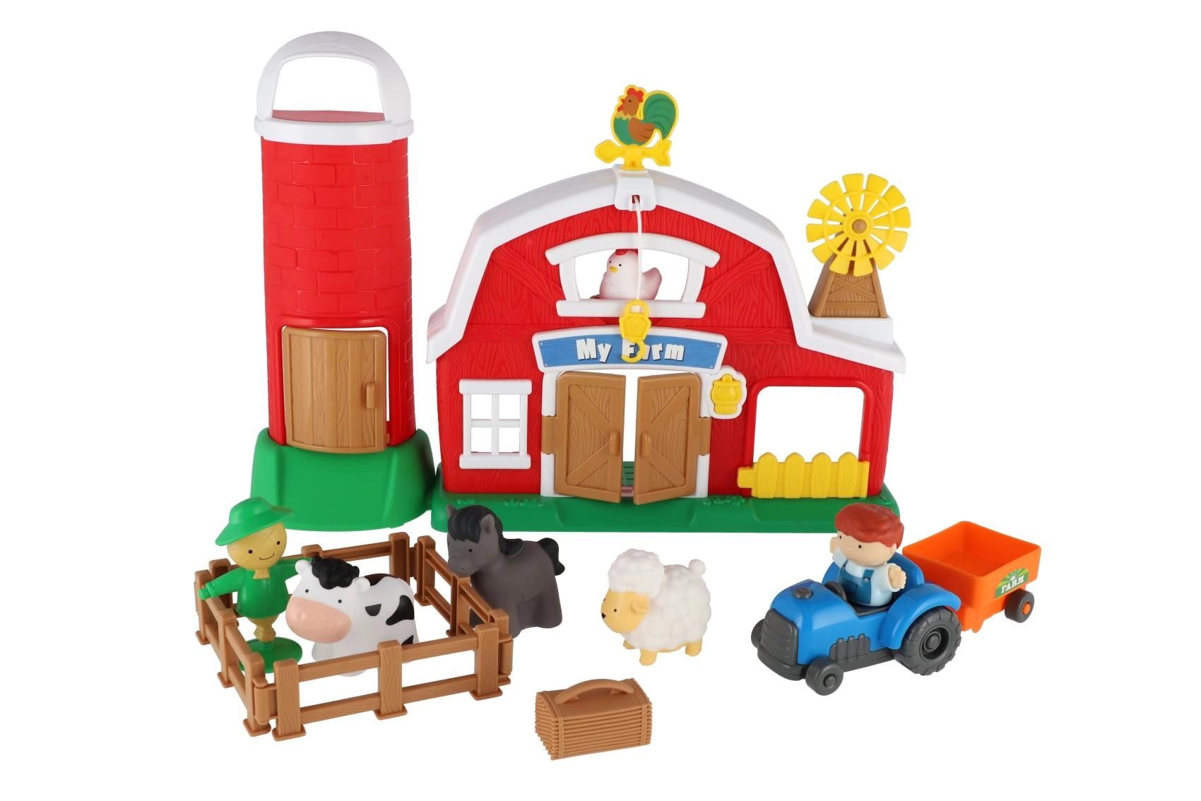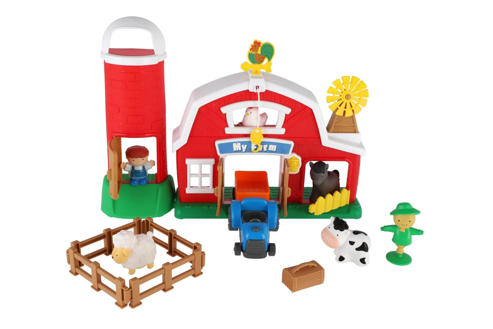 Dazugehörig sind Tiere, ein Bauer sowie Zubehör zum Bau von Zäunen und zum Transport von Ladung. Die stabile Ausführung aus Kunststoff mit abgerundeten Kanten sorgt für ein sicheres und robustes Spielzeug, das für kleinere Kinder geeignet ist.