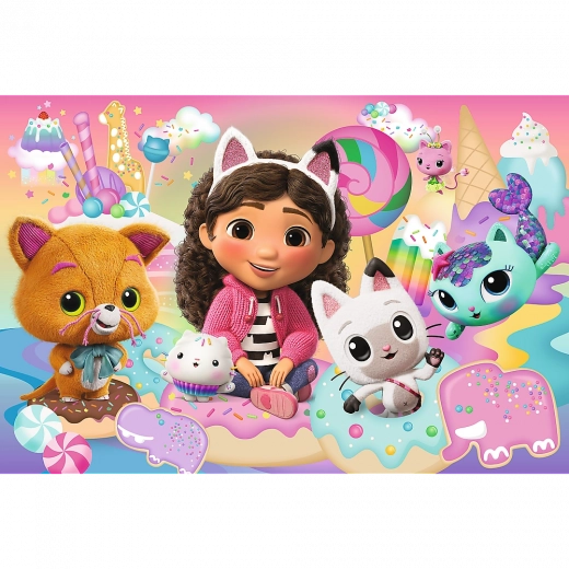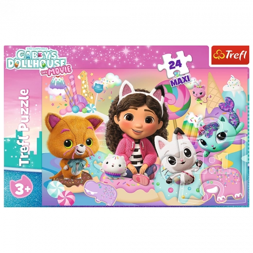 Entdecken Sie ein unterhaltsames Kinderpuzzle mit dem Motiv von GABBY’S DOLLHOUSE der Marke TREFL. Das Set enthält 24 extragroße Teile, ideal für kleine Hände und die ersten Puzzleversuche. Nach dem Zusammensetzen entsteht ein Bild mit den Maßen 60 × 40 cm. Die hochwertige Verarbeitung, robuste Materialien und eine leicht glänzende Oberfläche für ein leichteres Puzzeln begeistern jeden kleinen Fan der Katzenwelt.