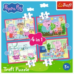 Farbenfrohes Set aus vier Puzzles mit Motiven von PEPPA PIG begeistert kleine Abenteurer. Enthält 4 einzelne Puzzles mit unterschiedlicher Teileanzahl (12, 15, 20 und 24) und eignet sich so für verschiedene Könnensstufen. Zusammengesetzt entstehen Bilder im Format 285 × 205 mm. Hergestellt in Polen aus umweltfreundlichen Materialien, geeignet für Kinder ab 3 Jahren.
