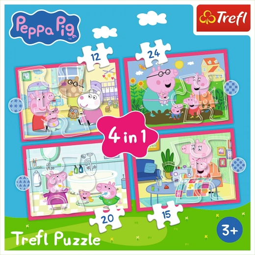 Puzzle-Set 4-in-1 mit Peppa-Pig-Motiven: 12, 15, 20 und 24 Teile, Bilder 285 × 205 mm. Umweltfreundliche Materialien, hergestellt in Polen, ideal für Kinder ab 3 Jahren.