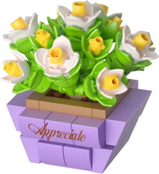 Die Teile lassen sich leicht zusammenklicken, sodass auch Einsteiger gut zurechtkommen. Zur Auswahl stehen mehrere Varianten – vom Kaktus über blühende Blümchen bis zu eleganten violetten Ähren. Jedes Modell wirkt beeindruckend und bildet eine 3D-Blütenkomposition in Pastellfarben.