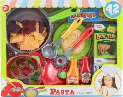 Lustiges Kunststoff-Küchenset für kleine Köche ab 2 Jahren. Enthält einen Topf mit Deckel, eine Pfanne, einen Teller, Schöpflöffel, Nudeln und weiteres Zubehör für kreatives Spielen. Fördert die Feinmotorik, Rollenspiel und Spaß in der Kinderküche.