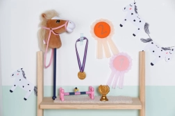 Steckenpferd mit Plüschkopf, Zubehör für Training und Wettkämpfe, Medaille, Siegerpokal