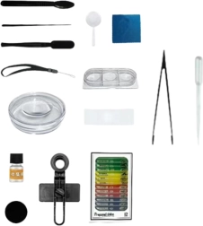 Zum Lieferumfang gehören ein Stativ mit LED, ein Smartphone-Halter für leichtes Fotografieren und Teilen der Entdeckungen sowie reichhaltiges Zubehör für die ersten Versuche im „Labor“. Die bunte Verpackung eignet sich hervorragend als Geschenk.