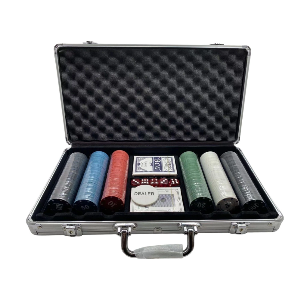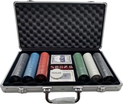 Genießen Sie überall die Casino-Atmosphäre mit diesem professionellen Pokerset. Enthält 500 Chips in vier Farben, zwei Sets Spielkarten und fünf rote Würfel. Alles ist in einem widerstandsfähigen Aluminiumkoffer mit Tragegriff und Schloss für sicheren Transport untergebracht.