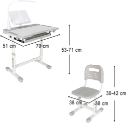 Praktischer Kinderschreibtisch mit Stuhl und USB-LED-Lampe in Grau schafft einen ergonomischen und aufgeräumten Platz zum Lernen und Kreativsein. Die Höhe von Tisch und Stuhl lässt sich stufenlos an das Wachstum des Kindes anpassen. Mit klappbarer Arbeitsplatte, großer Schublade mit Organizer, Taschenhaken, Becherhalter und Buchständer. Die LED-Lampe bietet 3 Lichtmodi und 3 Helligkeitsstufen für die richtige Beleuchtung bei Tag und Nacht.