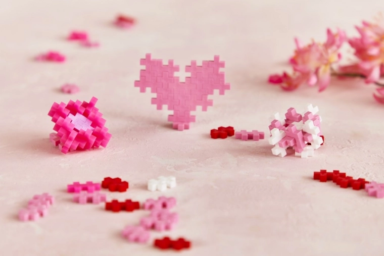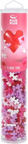 Plus-Plus I love you Röhre mit 240 Teilen in romantischen Farben. Kreatives Bauset für unterwegs, phthalatfrei, aus recyceltem Kunststoff, hergestellt in Dänemark. Ab 5 Jahren.