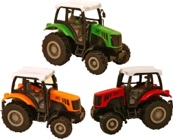 Kleiner, aber robuster Metalltraktor mit Aufzieh- (Pull-Back-) Antrieb, der alle kleinen Fans landwirtschaftlicher Technik begeistert. Einfach nach hinten ziehen und loslassen – der Traktor fährt von selbst nach vorne. Widerständiges Metallgehäuse und detailreiche Ausführung in drei Farben: Rot, Grün und Orange.