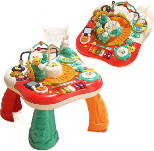 Der Tisch kann als klassischer Stehtisch oder als flaches Lernpanel verwendet werden – dank abnehmbarer Beine passt er sich leicht dem Alter des Kindes und dem verfügbaren Platz an. Das Zentrum des Spielspaßes ist das bewegliche Häschen, das Aufmerksamkeit und Hand-Auge-Koordination fördert, während Miniklavier und Trommel das Spiel mit fröhlichen Melodien und Klängen untermalen.