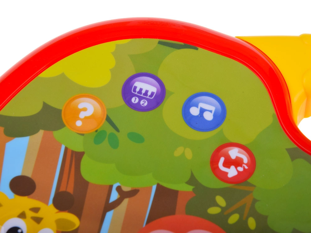 - Namen lernen: Beim Drücken eines Bildes spricht das Spielzeug den Namen des Tiers/ Instruments; nach Druck der roten Taste und erneutem Drücken des Bildes werden deren Geräusche abgespielt.