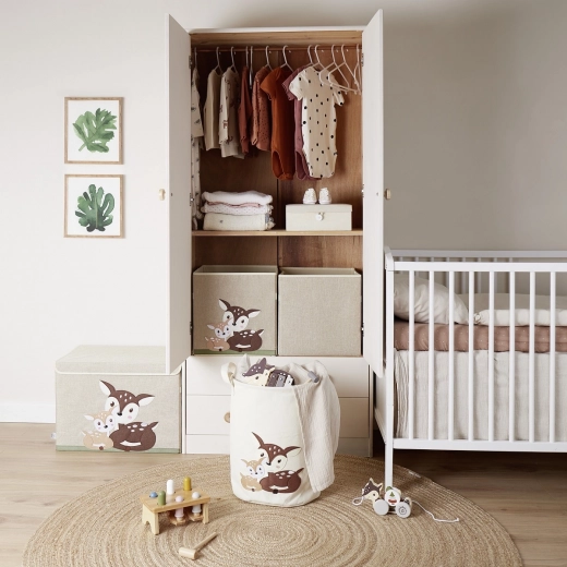 Der Bieco Aufbewahrungskorb mit dem niedlichen Rehkitzen-Motiv ist die ideale Wahl für die schnelle und übersichtliche Aufbewahrung von Spielzeug und Kleinigkeiten im Kinderzimmer. Die robuste Canvas-Konstruktion behält ihre Form, sodass der Korb auch bei voller Befüllung gut aussieht und zugleich zu einem dekorativen Element im Raum wird.
