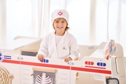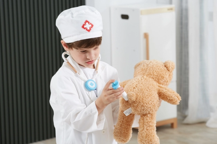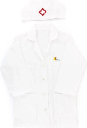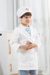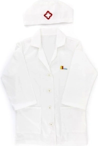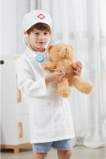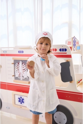 Der weiße Kittel und die Mütze mit medizinischem Symbol regen die kindliche Vorstellungskraft an und verleihen dem Spiel einen realistischen Touch.
