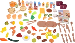 Topf, Pfanne, Kännchen, Teller, Besteck, Gewürze sowie vielfältiges Obst, Gemüse, Fleisch und Süßigkeiten – alles für stundenlanges Kochvergnügen.