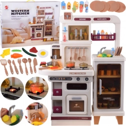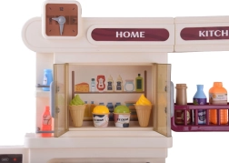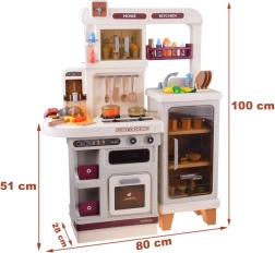 Diese geräumige interaktive Küche ermöglicht Kindern, Kochen, Backen und Abwaschen nachzuspielen. Dank des dampfenden Brenners mit Licht- und Kochgeräusch, dem öffnenden Ofen, Ablagen und Haken für Utensilien sowie dem Wasserspender wirkt das Spiel maximal realistisch und unterhaltsam.