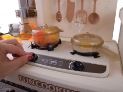 Der interaktive Brenner bietet zwei Modi: Kochgeräusch mit Licht oder Dampfeffekt mit Sound. Drehknöpfe und Bedienfeld verleihen dem Spiel einen realistischen Touch.
