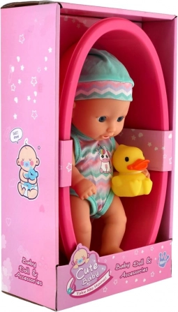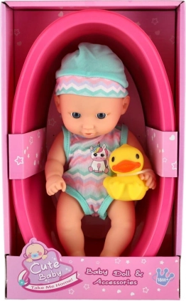 Die Puppe in der Badewanne mit gelbem Entchen schafft eine fertige Szene für Rollenspiele und tägliche Pflegerituale rund um das Baby.