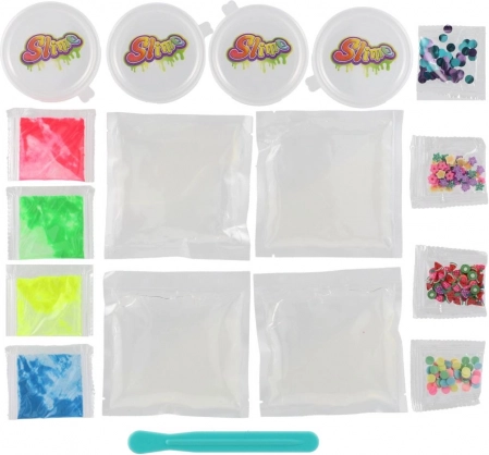- Spezialpulver und Zutaten zur Slime-Herstellung, Dekorationen (je nach Set)