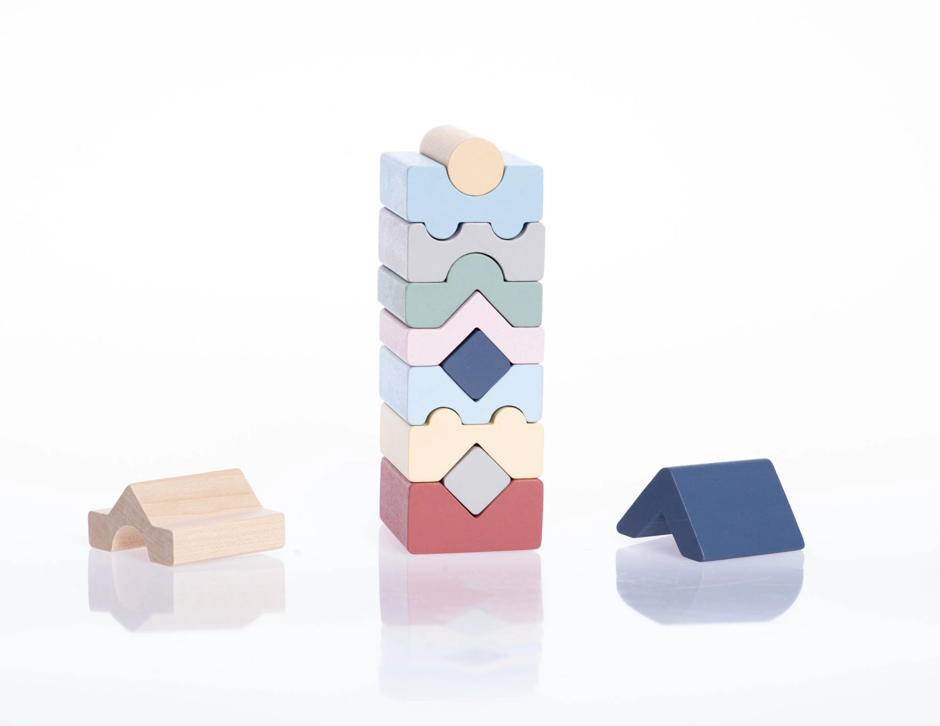 Entdecken Sie den hochwertigen Holzbausatz Cubika Pastell Turm XI mit 12 farbigen Teilen, die Kinder zu einem stabilen Turm stapeln. Das Spielzeug aus ökologischem Ahorn und Buche, gefärbt mit sicheren, wasserbasierten Farben, fördert Sensorik und Motorik, logisches Denken und Kreativität. Die Höhe des aufgebauten Turms beträgt 16 cm. Geeignet ab 18 Monaten, hergestellt in Europa, entspricht TÜV und der Norm EN 71.
