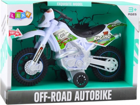 Weißes Motocross-Spielzeug mit Geländerädern, Licht und Sound. Robuste Ausführung, realistisches Design, Batterien 3× AG13 im Lieferumfang. Toller Spielspaß für Kinder.