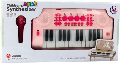 Rosa elektronisches Kinderklavier mit 24 Tasten, Mikrofon und Notenständer. 8 Klänge, 4 Rhythmen, Aufnahme und Wiedergabe. Ideal für den Einstieg in die Musik.