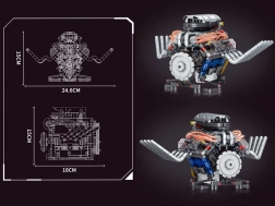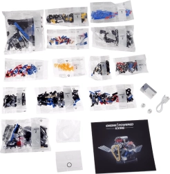 Enthalten sind nummerierte Beutel zur leichten Orientierung, ein USB-Ladekabel und eine übersichtliche bildliche Anleitung. Das effektvolle rote Licht verleiht dem Modell ein eindrucksvolles Aussehen und hebt bewegliche Teile hervor.