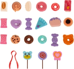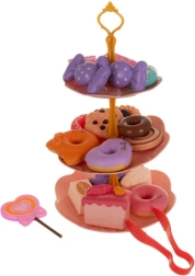 Lieferumfang: Koffer mit Griff und Metallverschluss, dreistöckiger Süßigkeitenständer, Teekanne mit Deckel, 4 Tassen, 4 Teller, 4 dekorative Löffel, Zange, Serviertablett, 21 Leckereien (Bonbons, Donuts, Macarons, Kekse), Gebrauchsanleitung, brauner Transportkarton.