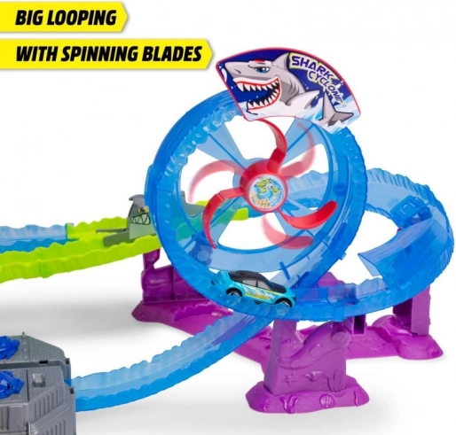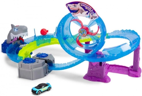 Genießen Sie eine adrenalingeladene Fahrt auf der motorisierten Autorennbahn mit Hai-Thema. Die Autos rasen mit Höchstgeschwindigkeit durch den Looping, passieren den Wassertunnel und können direkt beim riesigen Hai landen – der kann jedoch jederzeit seine Kiefer zuschnappen! Der integrierte Turbo-Booster katapultiert die Fahrzeuge auf maximale Geschwindigkeit und sorgt für ein intensives Rennerlebnis.