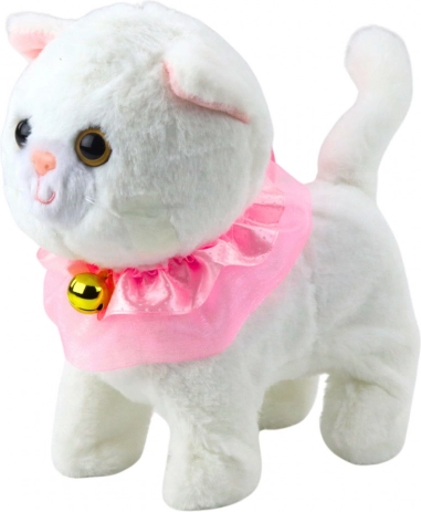 Süßes interaktives weißes Kätzchen aus weichem Plüsch mit rosa Rüschenkragen und einem Glöckchen am Hals erfreut jedes Kind. Dank der Leine mit Knopf beginnt es auf Knopfdruck zu laufen und gibt Miau-Geräusche von sich. Das Spielzeug fördert Empathie, Fürsorge und Kreativität und sorgt für stundenlangen Spielspaß.