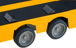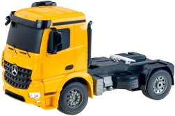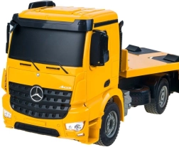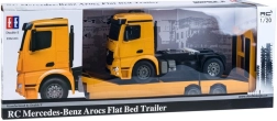Lizenzierter MERCEDES-BENZ Sattelzug mit Plateauauflieger für den Transport von Baumaschinen bietet realistische Motorgeräusche, Lichteffekte und vollständige Steuerung auf 2,4 GHz. Dank Gummireifen und einstellbarer Spur der Räder ist die Fahrt sanft und präzise. Der Auflieger verfügt über eine klappbare Rampe und verstellbare Stützen und kann elektronisch per Fernsteuerung an- und abgekoppelt werden.