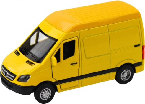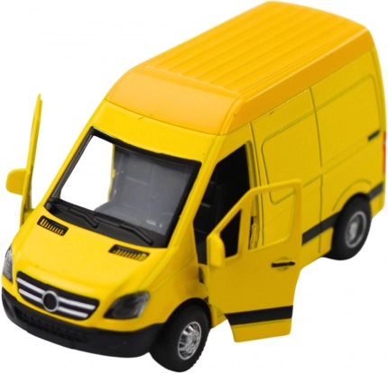 Realistischer gelber Lieferwagen im Maßstab 1:32, der Metallteile und hochwertigen Kunststoff kombiniert für höhere Haltbarkeit und attraktive Optik. Bietet Aufziehantrieb (Pull-Back), öffnende Türen und Licht- und Soundeffekte – ideal zum Spielen und als Sammlermodell.