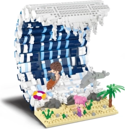 Das Modell kombiniert Details wie eine gewaltige Wasserwelle, einen Surfer auf dem Board, einen verspielten Delfin und einen Sandstrand mit Palme. Zwei Minifiguren verleihen der Szene Geschichte und Action – ideal zum Spielen oder als Dekoration.