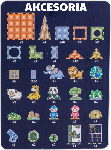 Magnetische Teile in verschiedenen Formen, Tierfiguren, Spielfiguren, thematische Accessoires (Baum, Felsen), Anleitung